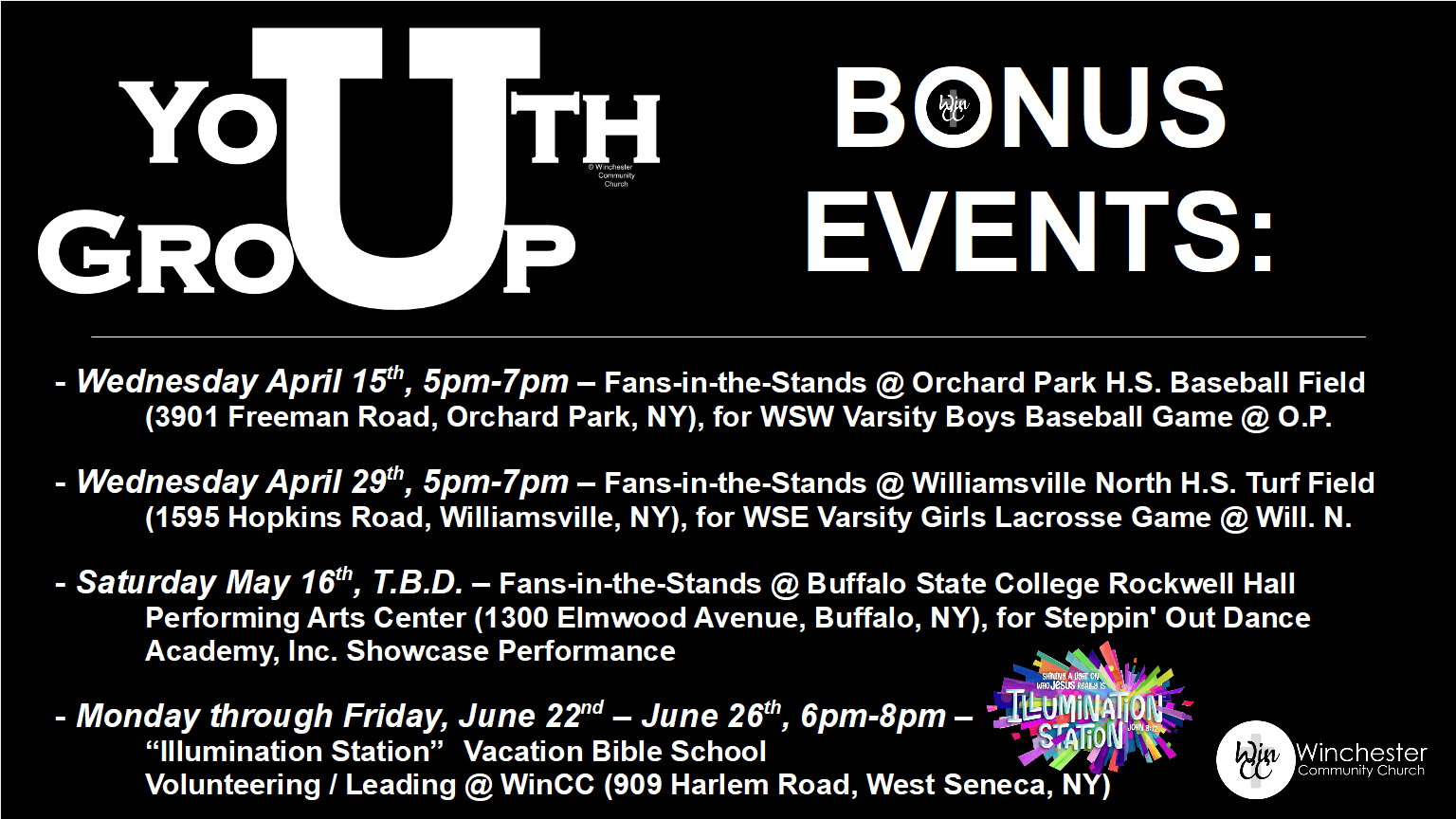 Invite your friends and join us as we get real and have fun! YoUth GroUp is a safe and welcoming space for teens in high school. Ask tough questions; get real answers; know and hear the truth about God from a fresh perspective. (Oh, and some great outings and large-scale outreaches, too!) Stay up-to-date through WinCC Instagram and the WinCC Facebook page for any special events or cancellations. See you on scheduled Wednesdays from 6:30pm-8pm at living rooms in homes across Western New York as part of HOME BASE–schedule listed below–from October through May (off during school breaks), as well as during special events and outings updated here!